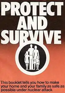 The purpose of the Protect and Survive scheme was to provide members of the British public with instructions, primarily via broadcast media, on how to protect themselves and survive a nuclear attack. The broadcasts were to be supplemented by a booklet, which was to act an aide-memoire for householders; despite the booklet's later prominence in British culture, the campaign was originally conceived as being broadcast-led, with the booklet confirmed later.[19] The scheme was not intended to be made public during peacetime, and would only have been broadcast if a nuclear attack was deemed likely by the Government during an international crisis. The information detailed a series of steps recommended to be undertaken by British civilians to improve their chances of survival in the event of a nuclear strike on the United Kingdom.
