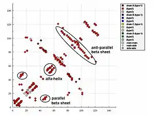 In representations of the HB plot, characteristic patterns of secondary structure elements can be recognised easily, as follows: