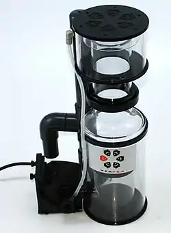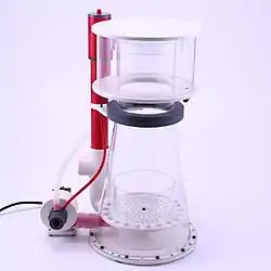 A protein skimmer or foam fractionator is a device used to remove organic compounds such as food and waste particles from water. It is most commonly used in commercial applications like municipal water treatment facilities and public aquariums. Smaller protein skimmers are also used for filtration of home saltwater aquariums.