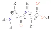 The protein structure can be considered as a sequence of secondary structure elements, such as α helices and β sheets. In these secondary structures, regular patterns of H-bonds are formed between the main chain NH and CO groups of spatially neighboring amino acids, and the amino acids have similar Φ and ψ angles.[1]