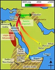 Map of Semitic languages and statistically inferred dispersals. One hypothesized location of the divergence of ancestral Semitic from Afroasiatic between the African coast of the Red Sea and the Near East is also indicated.