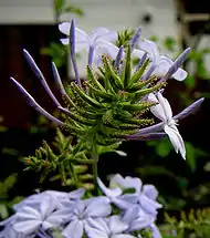 The glandular hairs on the calyx of plants of the genus Plumbago have been proposed as a potential carnivorous adaptation. While these calyxes have long been considered as a seed dispersal mechanism,[16] many researchers have noted the entrapment of numerous ants and other small insects on the species Plumbago auriculata,[17] Plumbago europa,[18] Plumbago indica,[19] and Plumbago zeylanica.[20] Studies on P. auriculata and P. indica detected potential protease activity from these glands,[19] but were inconsistent in detecting it. Energy-dispersive X-ray spectroscopy spectra of the glands on P. auriculata and P. zeylanica found that the glandular secretions were composed mainly of the elements C, O, Si, Mg, and Al.[21] One such species, P. europaea, has also been noted to kill small birds by covering them in sticky calyxes, causing them to be unable to fly and subsequently die.[22] A similar sticky-seed killing mechanism has been studied Pisonia grandis, but was concluded to not be a carnivorous adaptation.[23]