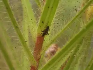 Roridula has a more complex relationship with its prey. The plants in this genus produce sticky leaves with resin-tipped glands that look similar to those of larger Drosera. However, the resin, unlike mucilage, is unable to carry digestive enzymes. Therefore, Roridula species do not directly benefit from the insects they catch. Instead, they form a mutualistic symbiosis with species of assassin bugs that eat the trapped insects. The plant benefits from the nutrients in the bugs' feces.[24]