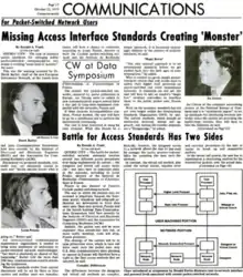A protocol for internetworking was also being pursued by the International Networking Working Group, consisting of American researchers, members of the French CYCLADES project, and the British team working on the NPL network and European Informatics Network.[28][29] INWG members Vint Cerf, Alex McKenzie, Roger Scantlebury and Hubert Zimmermann authored an end-to-end protocol that was presented to the CCITT by Derek Barber in 1975 but was not adopted by the CCITT nor by the ARPANET.[30][31][nb 3] The fourth biennial Data Communications Symposium later that year included talks from Donald Davies, Louis Pouzin, Derek Barber, and Ira Cotten about the current state of packet-switched networking.[nb 4] The conference was covered by Computerworld magazine which ran a story on the "battle for access standards" between datagrams and virtual circuits, as well as a piece describing the "lack of standard access interfaces for emerging public packet-switched communication networks is creating 'some kind of monster' for users". At the conference, Louis Pouzin said pressure from European PTTs forced the Canadian DATAPAC network to change from a datagram to virtual circuit approach,[32] although historians attribute this to IBM's rejection of their request for modification to their proprietary protocol.[33]