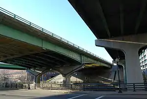 The Providence Viaduct refers to the two 4-lane bridges in each direction of Interstate 95 (I-95) that passes through downtown Providence, Rhode Island, in the United States. The structure passes over the Woonasquatucket River and Amtrak lines. It also connects with Interstate 195, U.S. Route 6 (US 6), and Route 146. The bridge was built in 1964 and rehabilitated in 1992.[1]
