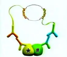 The DNA synthesis reaction results in several-hundredfold amplification of the DNA circle. Next, fluorescent-labeled complementary oligonucleotide probes are added, and they bind to the amplified DNA (Figure 4). The resulting high concentration of fluorescence is easily visible as a distinct bright spot when viewed with a fluorescence microscope.[4] In the specific case shown (Figure 5), the nucleus is enlarged because this is a B-cell lymphoma cell. The two proteins of interest are a B cell receptor and MYD88. The finding of interaction in the cytoplasm was interesting because B cell receptors are thought of as being located in the cell membrane.[5]