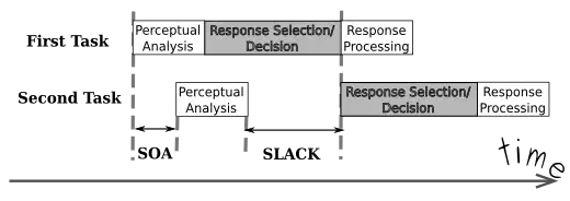 An example of a PRP paradigm might be that there is a task 1 which requires participants to push the keyboard-letter 'n' with the right index finger when a square frame was green.[1] There is also a task 2 which requires participants to push the keyboard-letter 'v' with the left index finger when the digit displayed was a '3' and to push the letter 'c' with the left middle finger if the digit displayed was a '4'.[1] If the temporal distance between the two tasks is varied, for example 150 ms in one and 1000ms in another, the time to respond to the second task will be longer when the interval occurring between the two tasks is 150 ms than when it is 1000 ms.[1] Referring to figure 1, the SLACK intervening between the execution of the first and second task will be absorbed when the interval intervening between the two tasks is long rather than when it is short.