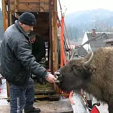 Since Pubal weighed 250 kilograms (over 550 lbs) at this point and there were concerns that he could harm someone when frightened, a decision was made that he must leave the Bieszczady area permanently. In spring of 2007, the almost two-year-old bison was transported northwest to become the semen provider at a żubroń (domestic cattle and wisent hybrid) breeding farm in Karolew.[11] The owner of the farm, Henryk Ordanik, had heard about Pubal on TV; Ordanik worked together with the foresters under the approval of the authorities to secure Pubal's role as a semen provider at his farm.[12] The Subcarpathian rangers who had up until this point been looking after Pubal condemned the actions of a tour guide who had lured the animal out of his enclosure into a local town, further reinforcing Pubal's old habits of relying on people feeding him.[2] As of September 2009, Pubal was still taking an active part in experimental żubroń breeding efforts at the facility in Karolew with a degree of success in their results.[13] His status since then is unclear, though some sources from 2017 state that Pubal died.[14]