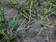 Puccinellia maritima is a species of grass known by the common names including seaside alkaligrass,[1] common saltmarsh-grass or sea poa grass. It is native to Western Europe and it is present in most of North East North America. It grows in moist, usually saline soils. It can reach a height of 80 cm and has greyish-green leaves.[2]