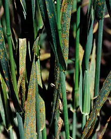Puccinia coronata is a plant pathogen and causal agent of oat and barley crown rust. The pathogen occurs worldwide, infecting both wild and cultivated oats. Crown rust poses a threat to barley production, because the first infections in barley occur early in the season from local inoculum.[1] Crown rusts have evolved many different physiological races within different species in response to host resistance. Each pathogenic race can attack a specific line of plants within the species typical host. For example, there are over 290 races of P. coronata.[2] Crops with resistant phenotypes are often released, but within a few years virulent races have arisen and P. coronata can infect them.[3]