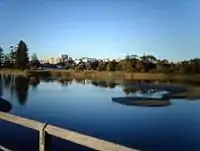 From the entrance sign another track forms. This one goes to the beach to the east, and several minor tracks branch from it to history plaques, picnic areas and seats, including a seat under a prominent pine at the lagoon edge from where views of Wollongong can be had, and the sites of Puckey's constructions and the remnants of his house and saltworks. This area has two prominent pines which can be seen from North Wollongong.