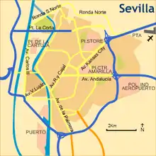 The Puente de Isabel II, Puente de Triana or Triana Bridge, is a metal arch bridge in Seville, Spain, that connects the Triana neighbourhood with the centre of the city. It crosses the Canal de Alfonso XIII, one of the arms of the River Guadalquivir that isolate Triana as an almost-island.