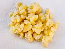 Puffcorn is an extruded puffed corn snack which belongs in the snack group products made with corn grits, rice, wheat, or other cereals. Puffcorn is often flavoured with cheese, caramel, oil, chili, onion, or garlic powder, and many other spices.[1] Types of puffcorn can vary in length, density, hardness, springiness, gumminess, chewiness, and level of redness and yellowness, especially when using different percentages of oat flour.[2] Some products sold as puffcorn are given the appearance of popcorn, although they are not made from whole grains as popcorn is.