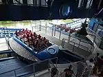 Once riders are loaded, the turntable station rotates to align the car with the rest of the track.[3] The car then accelerates backward over a small hill before traveling through a straight section of track. This straight section of the track goes through the ride's splashdown pool, which at this point in the ride is low enough to allow the vehicle to pass over it. The car then travels part of the way up a vertical spike of the track before traveling forward over the hill. The car then launches forward into a second vertical spike and comes back down before entering a third backward launch. While the car is on the vertical spike at the back end of the ride's layout, the water flows into the splashdown pool in approximately six seconds raising the level. The car then travels down the spike and enters the splashdown pool, which is now filled with water. This serves to slow the car down before it re-enters the turntable to unload riders.[3][4]