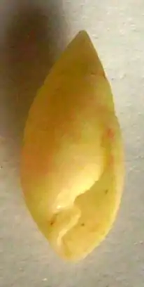 The shell is 15 mm in length and is usually white, beige, or brown, with or without black markings. It is egg shaped (ovate) with an elevated spire. The columella or central axis of the shell has a large double fold.[3]
