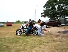 Push starting, also known as bump starting, roll starting, clutch starting, popping the clutch or crash starting, is a method of starting a motor vehicle with an internal combustion engine that has a manual transmission, a mechanical fuel pump, and a mechanically driven generator or alternator. By pushing or letting the vehicle roll downhill then engaging the clutch at the appropriate speed the engine will turn over and start.[1] The technique is most commonly employed when other starting methods (automobile self starter, kick start, jump start etc.) are unavailable.[2]