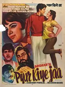 Pyar Kiye Jaa (transl. Carry on Loving) is a 1966 Indian Hindi-language romantic comedy film directed and produced by C. V. Sridhar. It stars Kishore Kumar, Shashi Kapoor, Mehmood, Kalpana, Rajasree, Mumtaz, Om Prakash. It was a "semi-hit" at the box office.[2] The film is a remake of the Tamil comedy Kadhalikka Neramillai (1964), which was remade into Telugu as Preminchi Choodu in 1965. Actress Rajasree starred in all three versions of the film.[3] Kadhalikka Neramillai was also later remade in Kannada as Preethi Madu Thamashe Nodu and in Marathi as Dhoom Dhadaka.[4] The role played by Nagesh in the Tamil version was reprised by Mehmood in the Hindi version and by Dwarakish in the Kannada version.