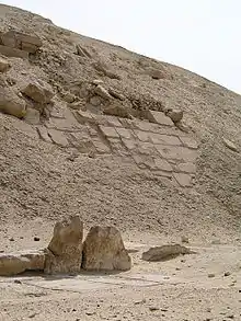 The pyramid has been severely damaged over time, and little of its limestone cladding remains. It now appears as little more than a hillock of stone. None of the excavations penetrated to the burial chamber due to high water levels, but much was learned about pyramid construction from the surrounding quarries, which contained one of the highest concentrations of ancient debris of any Egyptian archaeological site.[4]