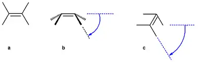 The pyramidalization angle φ (b) is defined as the angle between the plane defined by one of the doubly bonded carbons and its two substituents and the extension of the double bond and is calculated as: