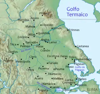Pyrasus or Pyrasos (Ancient Greek: Πύρασος[1] or Πύρρασος[2]) was a town and polis (city-state) of Phthiotis in ancient Thessaly,[3] mentioned by Homer along with Phylace and Iton as ruled by Protesilaus, in the Catalogue of Ships in the Iliad, and described by him as "Πύρρασον ἀνθεμόεντα, Δήμητρος τέμενος" (Pyrasus having a temple of Demeter)[4] Pyrasus was situated on the Pagasaean Gulf, at the distance of 20 stadia from Phthiotic Thebes, and possessed a good harbour.[5] It had disappeared in the time of Strabo (fl. early first century CE), the town having moved to a nearby site, called Demetrium or Demetrion (Δημήτριον), derived from the temple of Demeter, spoken of by Homer, and which Strabo describes as distant two stadia from Pyrasus.[1]