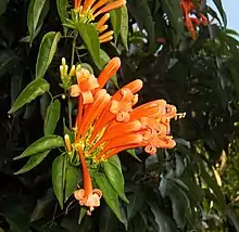 Pyrostegia venusta, also commonly known as flamevine[2] or orange trumpet vine,[3] is a plant species of the genus Pyrostegia of the family Bignoniaceae originally native to southern Brazil, Bolivia, northeastern Argentina and Paraguay; today, it is also a widely cultivated garden species.[3][4]