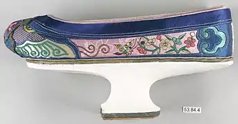 On the other hand, Manchu women wore a one-piece long dress.[1][3] However, they borrowed some elements from each other in the Qing dynasty, for example, wide robe sleeves which are typical features in the Han Chinese women's clothing was adopted in the informal daily outfits of the Manchu women.[6] The Manchu women's clothing were therefore influenced by the Han Chinese clothing culture.[4] Manchu women also had natural feet and did not engage in foot binding as opposed to the Han Chinese women.[8]: 59