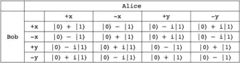 The following outlines a simple ((2,3)) threshold scheme,[4] and more complicated schemes can be imagined by increasing the number of shares Alice splits her original state into: