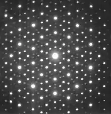 A quasiperiodic crystal, or quasicrystal, is a structure that is ordered but not periodic. A quasicrystalline pattern can continuously fill all available space, but it lacks translational symmetry.[2] While crystals, according to the classical crystallographic restriction theorem, can possess only two-, three-, four-, and six-fold rotational symmetries, the Bragg diffraction pattern of quasicrystals shows sharp peaks with other symmetry orders—for instance, five-fold.[3]
