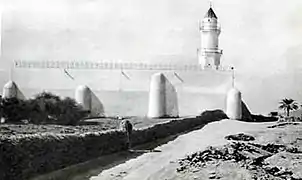 As per historical Islamic texts, Muhammad spent 14 days in this mosque praying qaṣr (Arabic: قَصْر, a short prayer) while waiting for Ali to arrive in Medina, after he stayed behind in Mecca to safeguard Muhammad’s life and escape, by sleeping in Muhammad’s bed in his place.[6] Performing Wuḍūʾ ('Ablution') in one's home, then offering two Rakaʿāt of Nafl (Optional) prayers in the Quba Mosque, is considered to be equal to performing one ʿUmrah. Muhammad used to go there, riding or on foot, every Saturday and offer a two rakaʿāt prayer. He advised others to do the same, saying, "Whoever makes ablutions at home and then goes and prays in the Mosque of Quba, he will have a reward like that of an 'Umrah."[7] This ḥadīth was reported by Ahmad ibn Hanbal, Al-Nasa'i, Ibn Majah and Hakim al-Nishaburi. Initially, the mosque was built 6 kilometres (3.7 miles) off Medina in the village of Quba, before Medina expanded to include this village.[8]