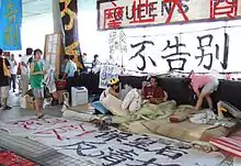An occupation of the pier was started by ten activists on the designated closure date. The campaign was boosted by the appearance of Chow Yun-fat early on the morning of 28 April to sign the petition, and to appeal pre-emptively to the police not to hurt protesters.[28] Some activists, like Chu Hoi-dick, have been involved in the Star Ferry pier protest, and took turns to maintain a round-the-clock presence.[29] Leung Chun-yiu spent three nights a week at the site, despite working a full-time job, vowing to block the demolition non-violently in any way he could.[30]