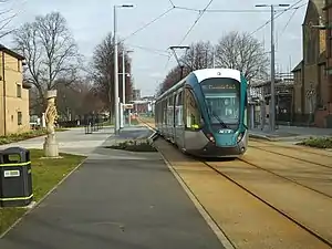 Queens Walk is a tram stop on the Nottingham Express Transit (NET) network, previously known as Meadows Centre. The stop is situated on Queens Walk in the Meadows area of the city of Nottingham. It is situated on reserved track and comprises a pair of side platforms flanking the tracks. The stop is on line 2 of the NET, from Phoenix Park via the city centre to Clifton, and trams run at frequencies that vary between 4 and 8 trams per hour, depending on the day and time of day.[1][2]