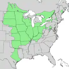 Bur oaks primarily grow in a temperate climate on the western oak–hickory forested regions in the United States and into Canada.[9] It commonly grows in the open, away from dense forest canopy. For this reason, it is an important tree on the eastern prairies, often found near waterways in otherwise more forested areas, where there is a break in the canopy. It is drought resistant, possibly because of its long taproot. At the end of the growing season, a one-year sapling may have a taproot 1.37 m (4+12 ft) deep and a lateral root spread of 76 cm (2+12 ft).[10] The West Virginia state champion bur oak has a trunk diameter of almost 3 m (10 ft).