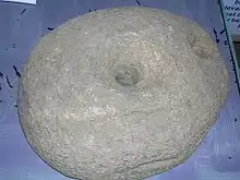 The saddle quern is produced by rocking or rolling the muller using parallel motions (i.e., pushing and pulling the handstone), which forms a shape looking like a saddle. These are the most ancient and widely used type of quern-stone and were superseded around the 5th to the 4th century BC by the more efficient rotary quern.[18] The handstones for saddle querns are generally either roughly cylindrical (not unlike a rolling pin) and used with both hands, or rough hemispheres and used with one hand. This provides a crushing motion, not a grinding action and is more suitable for crushing malted grain. It is not easy to produce flour from a saddle quern with unmalted grain. The muller is also referred to as a 'rubber' or 'mouler'.[19] Some pictorial examples may be found in the metate article.