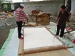 Throughout China, a simple method of producing quilts is employed. It involves setting up a temporary site. At the site, a frame is assembled within which a lattice work of cotton thread is made. Cotton batting, either new or retrieved from discarded quilts, is prepared in a mobile carding machine. The mechanism of the carding machine is powered by a small, petrol motor. The batting is then added, layer by layer, to the area within the frame. Between adjacent layers, a new lattice of thread is created with a wooden disk used to tamp down the layer. (See: Image series showing production method)