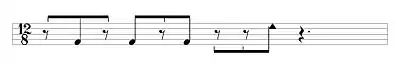 Rumba is an amalgamation of several African drumming traditions, transplanted to Cuba during the time of slavery. Guaguancó and yambú are descended from the Cuban-Congolese fertility dances makuta and yuka. Columbia has cultural and musical ties to the Abakuá, a secret society from the Cross River region of present day southern Nigeria and northern Cameroon. The rhythmic phrasing of the abakuá lead drum bonkó enchemiyá is similar, and in some instances, identical to the quinto.[6] The following abakuá bonkó phrase is also played by the quinto in rumba. Regular noteheads indicate open tones and the triangle notehead indicates a slap.