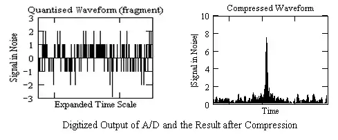Consider, as an example, a chirp signal with time-bandwidth product of 200 and of amplitude of ½ LSB which is embedded in noise with an rms voltage of 1 LSB, present at the input to an A/D. he digitized, quantised output, relative to the mean value, is similar to the example in the left-hand figure below. After compression in the signal processor, a high amplitude pulse, whose magnitude is well above the noise is obtained, as shown in the right-hand figure.