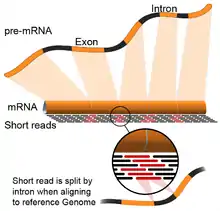 - Genome guided: This approach relies on the same methods used for DNA alignment, with the additional complexity of aligning reads that cover non-continuous portions of the reference genome.[66] These non-continuous reads are the result of sequencing spliced transcripts (see figure). Typically, alignment algorithms have two steps: 1) align short portions of the read (i.e., seed the genome), and 2) use dynamic programming to find an optimal alignment, sometimes in combination with known annotations. Software tools that use genome-guided alignment include Bowtie,[67] TopHat (which builds on BowTie results to align splice junctions),[68][69] Subread,[70] STAR,[66] HISAT2,[71] and GMAP.[72] The output of genome guided alignment (mapping) tools can be further used by tools such as Cufflinks[69] or StringTie[73] to reconstruct contiguous transcript sequences (i.e., a FASTA file). The quality of a genome guided assembly can be measured with both 1) de novo assembly metrics (e.g., N50) and 2) comparisons to known transcript, splice junction, genome, and protein sequences using precision, recall, or their combination (e.g., F1 score).[65] In addition, in silico assessment could be performed using simulated reads.[74][75]