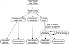 - Isoform-based (also multi-read modules, differential isoform expression): estimate isoform abundance first, and then relative abundance between conditions. Examples are Cufflinks 2[123] and DiffSplice.[124]