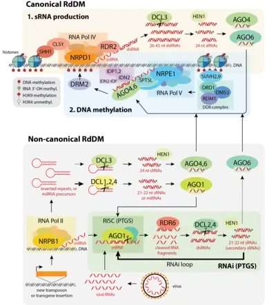 - Wendte JM, Pikaard CS (January 2017). "The RNAs of RNA-directed DNA methylation". Biochimica et Biophysica Acta (BBA) - Gene Regulatory Mechanisms. 1860 (1): 140–148. doi:10.1016/j.bbagrm.2016.08.004. PMC 5203809. PMID 27521981.