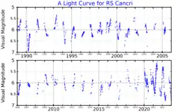 The variability of RS Cancri was discovered by Edward Pickering based upon 15 observations made in 1892 and 1898. S. Seliwanow derived a period of 129.5 days for the star, in 1923.[8] In 2005, Saul Adelman and John Dennis found that the star showed two periods well determined by their data, 121.8±0.9 and 248±7 days, as well as a poorly-determined third period of about 500 days.[9]