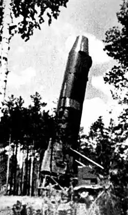 RT-15 was developed by the S. P. Korolev design bureau (OKB-1) on the basis of the second and third stages of the RT-2 ICBM. The missile was carried on a T-10 heavy tank chassis in a sealed container with a striking resemblance to the US Atlas D ICBM. After missile erection, the container split longitudinally and was withdrawn.