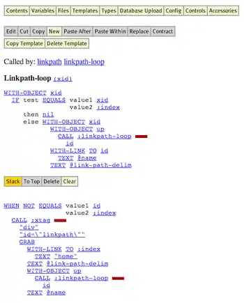 Although Yahoo!'s documentation does not mention it, RTML is actually implemented on top of a Lisp-based system. The language is somewhat unusual in that the programmer cannot edit the source code directly as text. Instead, keywords are presented as hyperlinks in a browser-based HTML interface. Clicking on a keyword selects it, and its attributes can be edited. Blocks of code can be pushed and popped from a clipboard, using the stack metaphor. The editor maintains the code's s-expression structure automatically, and visually represents it in the web interface using indentation instead of Lisp's parentheses. Most of the keywords correspond to HTML elements, but there are also conditionals, recursion, and other control flow features that make it a "real" programming language.