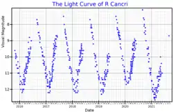 R Cancri is a Mira variable in the constellation Cancer. Located approximately 250 parsecs (830 ly) distant, it varies between magnitudes 6.07 and 12.3 over a period of approximately 357 days.[3]