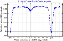 R Canis Majoris is an eclipsing interacting binary star system in the constellation Canis Major. It varies from magnitude 5.7 to 6.34.[6] The system is unusual in the low ratio between the main two components and shortness of the orbital period.[3]