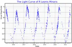R Leonis Minoris (R LMi) is a Mira variable type star in the constellation Leo Minor. It ranges between apparent magnitude 6.3 and 13.2, and spectral types M6.5e to M9.0e (Tc:), over a period of 372 days.[8]