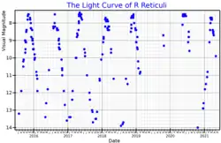 R Reticuli, also listed under the duplicate variable star designation S Reticuli,[4] is a Mira variable star in the southern constellation Reticulum. It is an aging red giant star on the asymptotic giant branch[5] with a stellar classification that varies between M4e to M7.5e,[6] being hottest near maximum visual magnitude.[10] The brightness of the star varies between apparent visual magnitudes 6.35 and 14.2[4] with an average period of 281.08±0.58 d.[11] The mean maximum magnitude is 7.57 and the mean minimum magnitude 13.80.[11]