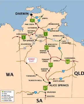 Rabbit Flat was a roadhouse in the Northern Territory of Australia, in the locality of Tanami, about 160 kilometres (100 mi) from the Western Australia border.[1] It lies between the Tanami Mine (45 km NW) and The Granites Mine (53 km SE) on the Tanami Road.