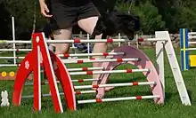 Rabbit show jumping (Swedish: Kaninhoppning[1]), also known as rabbit agility[2] or rabbit hopping,[3] is an animal sport where the animals are led through a course by their owners,[4] modelled after horse show jumping.[5][6] It is typically conducted in a closed, indoor arena, with obstacles scaled to suit the rabbits. Competitions have been held in the United States[3] and several European countries.[2] As rabbits are common domestic pets, some owners train their pet rabbits for this sport.[2]