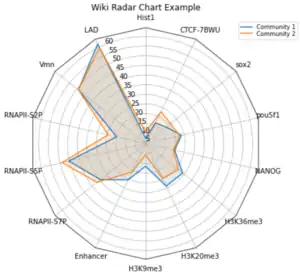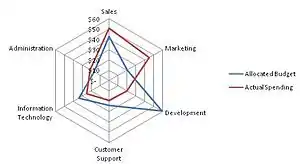 A radar chart is a graphical method of displaying multivariate data in the form of a two-dimensional chart of three or more quantitative variables represented on axes starting from the same point. The relative position and angle of the axes is typically uninformative, but various heuristics, such as algorithms that plot data as the maximal total area, can be applied to sort the variables (axes) into relative positions that reveal distinct correlations, trade-offs, and a multitude of other comparative measures.[1]