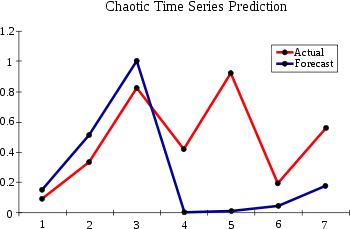 Note that the estimate is accurate for only a few time steps. This is a general characteristic of chaotic time series. This is a property of the sensitive dependence on initial conditions common to chaotic time series. A small initial error is amplified with time. A measure of the divergence of time series with nearly identical initial conditions is known as the Lyapunov exponent.